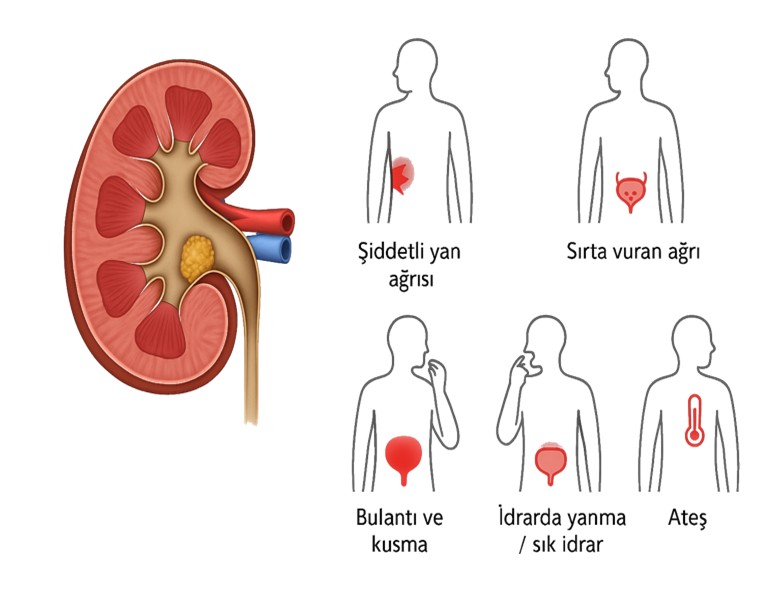 Böbrek taş hastalığı, bazen hiçbir belirti vermeden tesadüfen tespit edilebilirken, bazı durumlarda idrar yoluna düşerek çok acı verebilir. Çoğu zaman ağrı kolik şeklinde, dalgalar halinde ve kıvrandırıcıdır. Ağrı yan (böğür) bölgesinde başlar ve kasık bölgesine yayılır. Ağrı dışında, bulantı, kusma, idrar yaparken yanma, idrardan kan gelmesi ve idrar yapma sorunları en önemli belirtilerdir.